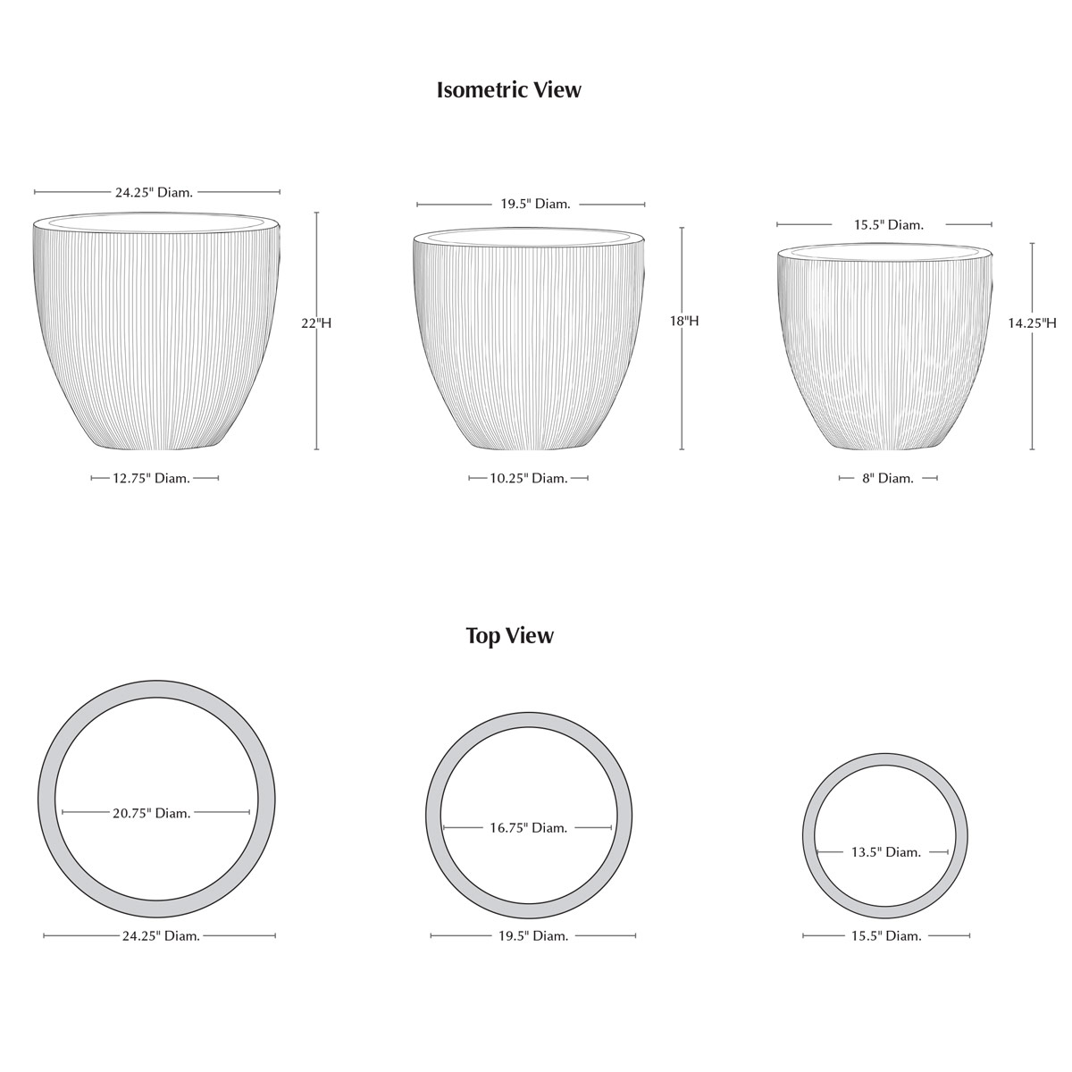Create a modern vibe in your outdoor space with the sleek, minimalist style of our fiberglass Airy Planters. These broad round planters feature a vertical stripe pattern and are available in four size options, making them suitable for a variety of plants and shrubs.