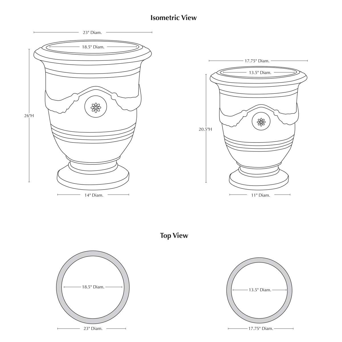 This set of two Anduze Urns are handcrafted from terracotta, with a classic style decorative design. Ideal for contemporary or traditional outdoor spaces, these containers are suitable for various specimens of shrubs, roses, or flowers. Also available in glaze finishes as the Coquille Anduze Urns. Drain Hole included.