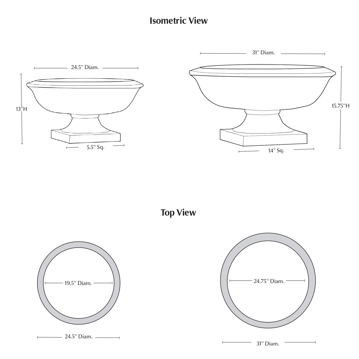 | Size | 31″DIA. x 15.75″H | 186 lbs 24.5"DIA. x 13"H | 105 lbs |