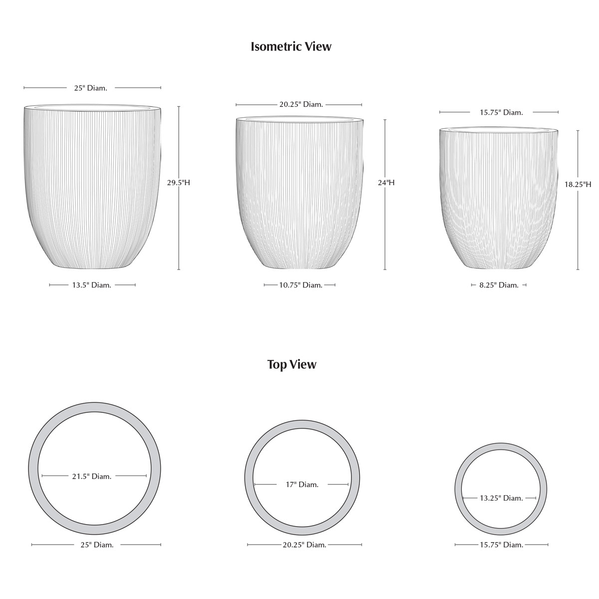 | Size | 25.25"DIA. x 29.5"H | 19 lbs 20.5"DIA. x 24"H | 12 lbs 15.75"DIA. x 18.5"H | 8 lbs |