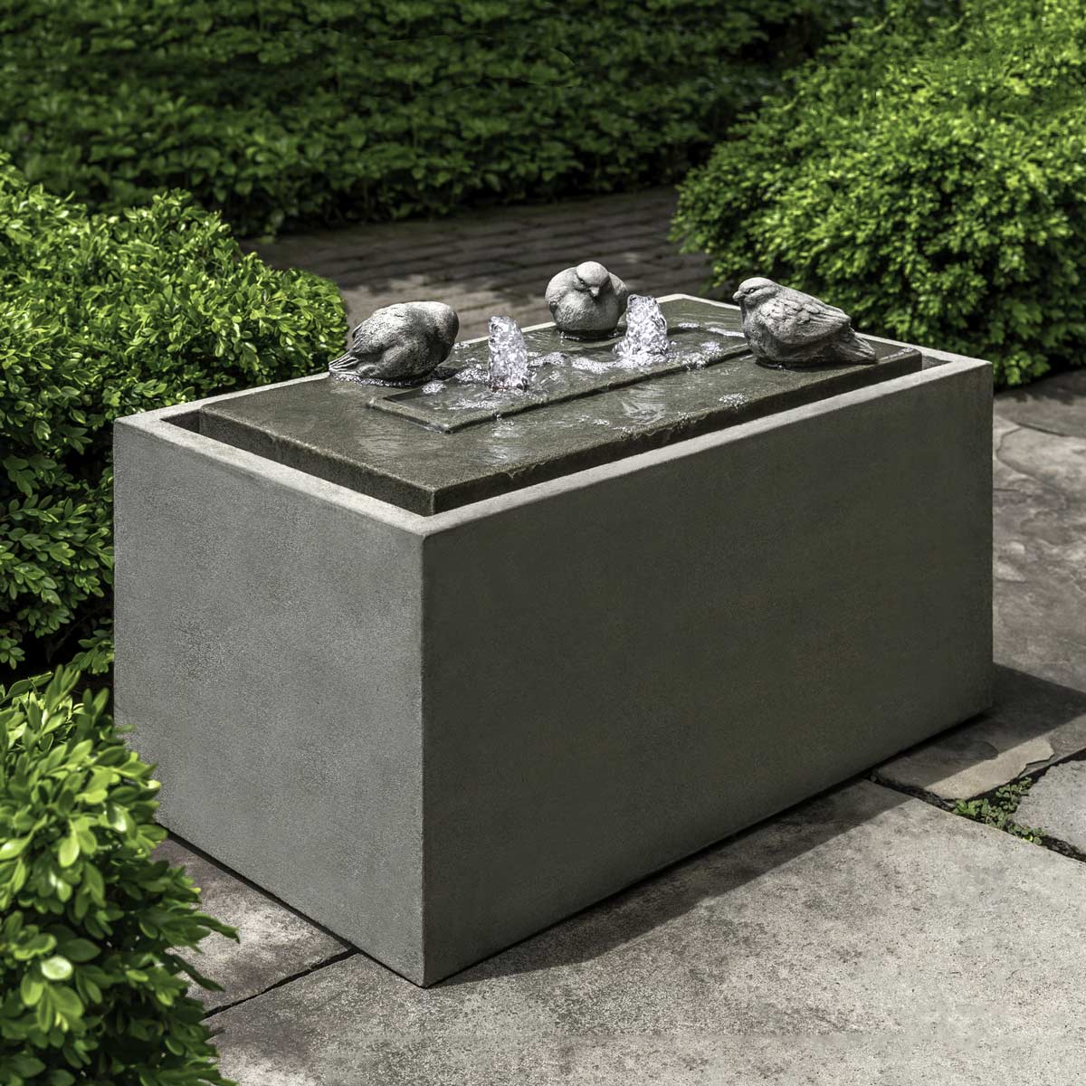 Three decorative birds perch atop our Avondale Fountain adding a quaint feel to this modern, two plume water feature. This rectangular fountain creates a focal point for garden spaces and comes in a range of custom finishes. Also available without the birds, as our Lutea Fountain.
