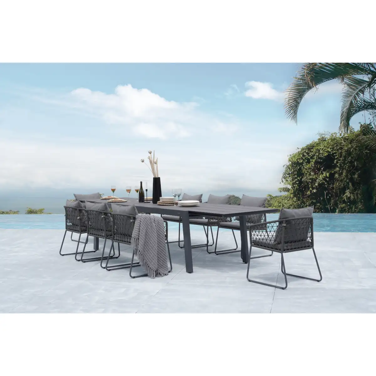 Create a place to entertain friends and family in modern style. Invite your dinner guests around this practical large extension table made with durable and easy-care high pressure laminate with aluminum frame. The BAIA collection transforms any outdoor space into your favorite stylish eating place. Seats 4-8.