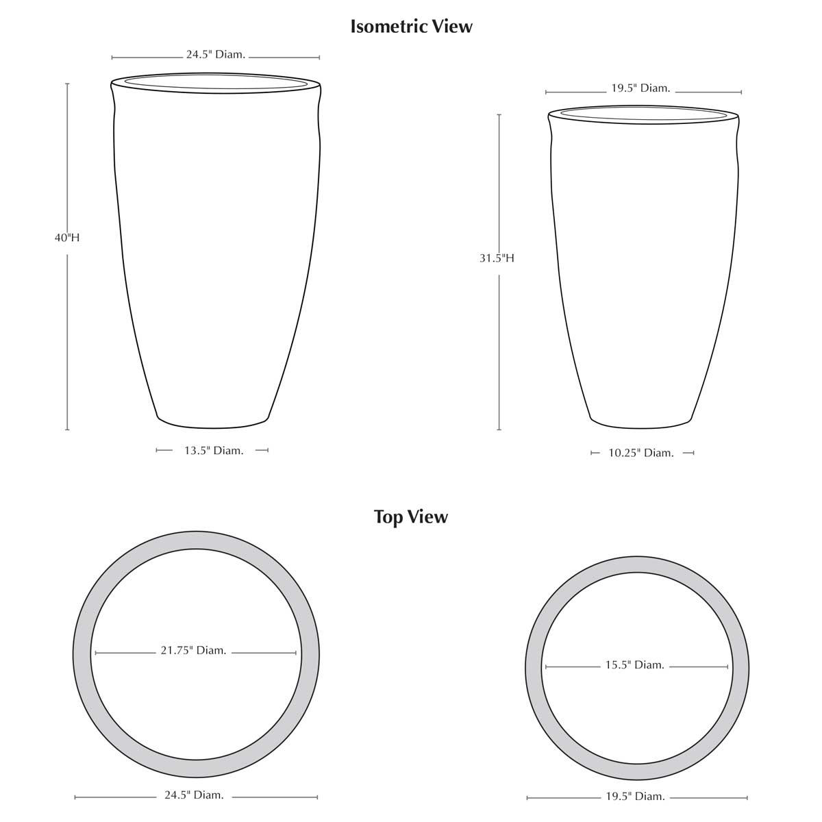 | Size | Set of 2 24.5″ DIA. x 40″H | 165 lbs 19.5″ DIA. x 31.5″H | 83 lbs |