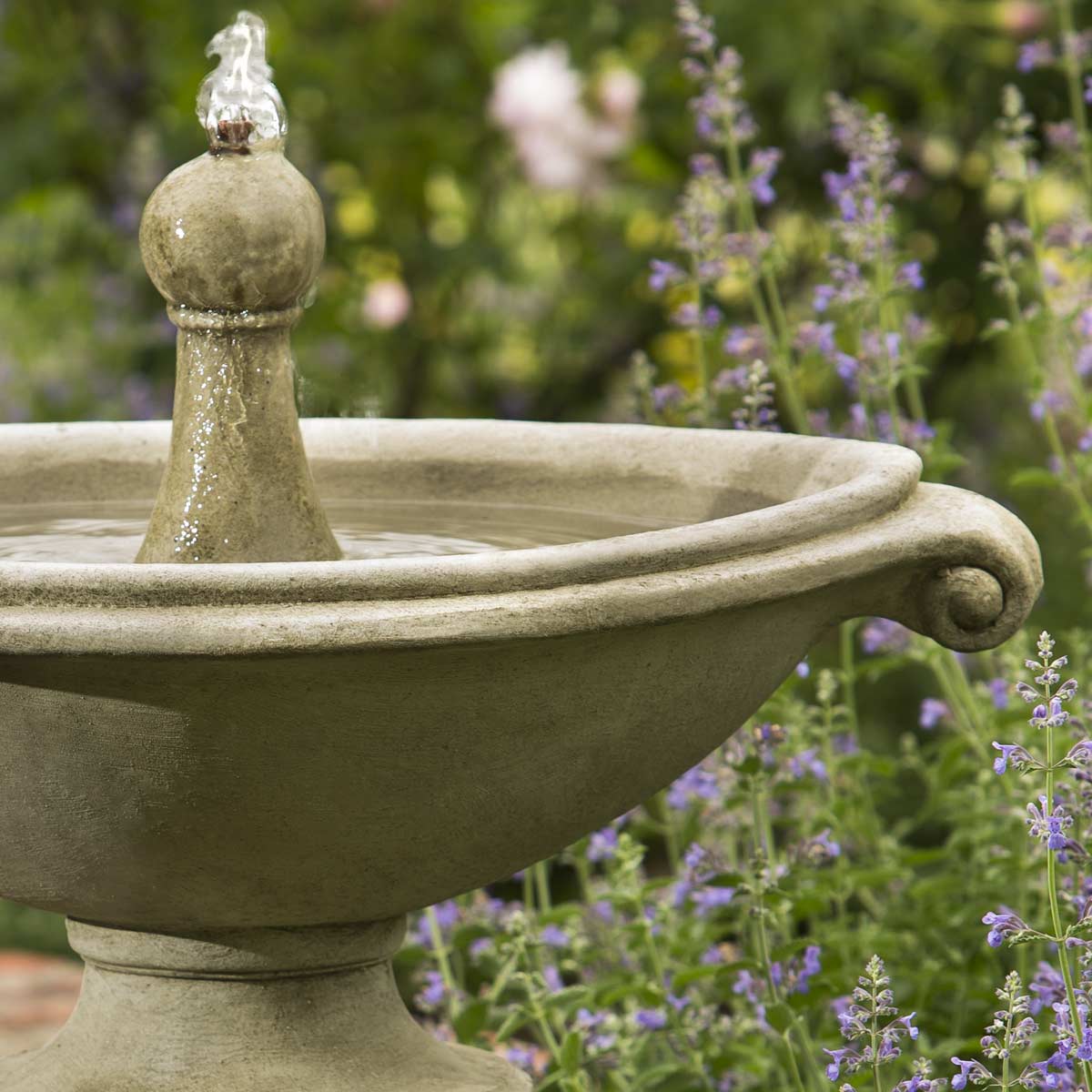 The Borghese Fountain is best served on stairs, next to a door, or somewhere a bubbling fountain would be appreciated. The basin is an oval shape and the water spurts out of a pawn shaped finial on top. A larger fountain with the same shape, but higher water capacity would be the Borghese in Basin Fountain.