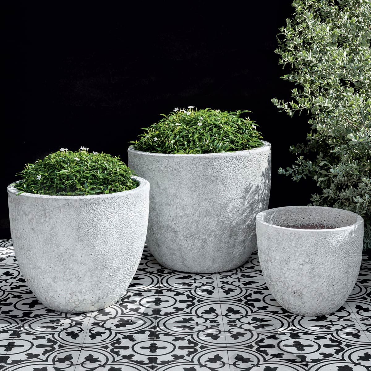The three-piece Caipirinha Planter set features a wide taper shape that offers a good option for housing larger root balls. Handcrafted from terracotta, these contemporary garden containers include drainage holes in the bases and come in two contemporary finishes.