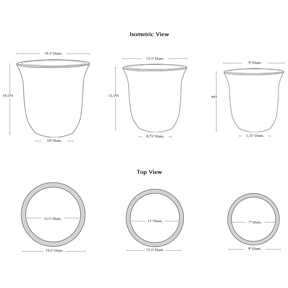 | Size | Set of 3 19.5"DIA x 19.5″H | 54 lbs 13.5"DIA x 13.5″H | 25 lbs 9"DIA x 9″H | 10 lbs |