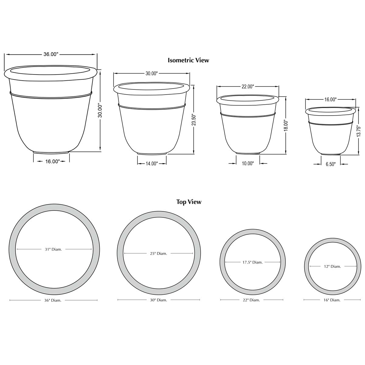 | Size | 36"DIA x 30"H | 354 lbs 30"DIA x 23.5"H | 233 lbs 22"DIA x 18"H | 130 lbs 16"DIA x 13.75"H | 54 lbs |