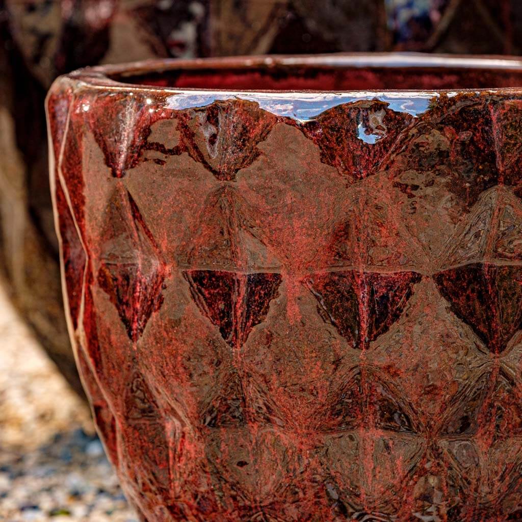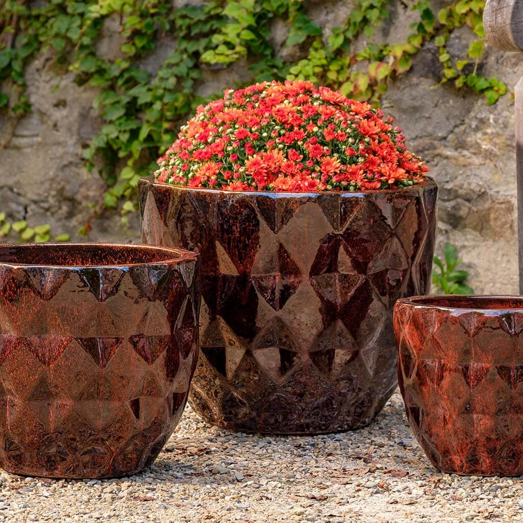 The 3 piece Castillon Planter Set blends geometric artistry with the timeless beauty of natural terra cotta. Its distinctive diamond pattern adds sculptural texture, while the deep Bordeaux finish offers a bold yet refined touch. Designed to elevate entrances, terraces, and lounges, this planter brings a sense of European luxury and handcrafted sophistication to any indoor or outdoor setting