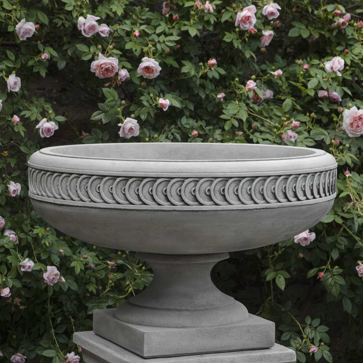 The Chatham Urn features a distinctive disc pattern around its rim with a silhouette that is both eye-catching and stately. Crafted from cast stone, this broad and shallow container becomes a statement piece whether it is filled with colorful foliage or elevated on a pedestal.