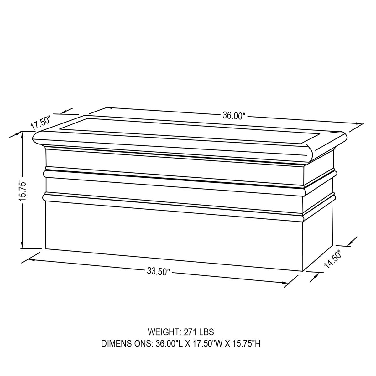 | Size | 36"L x 17.5"W x 15.75"H | 271 lbs |