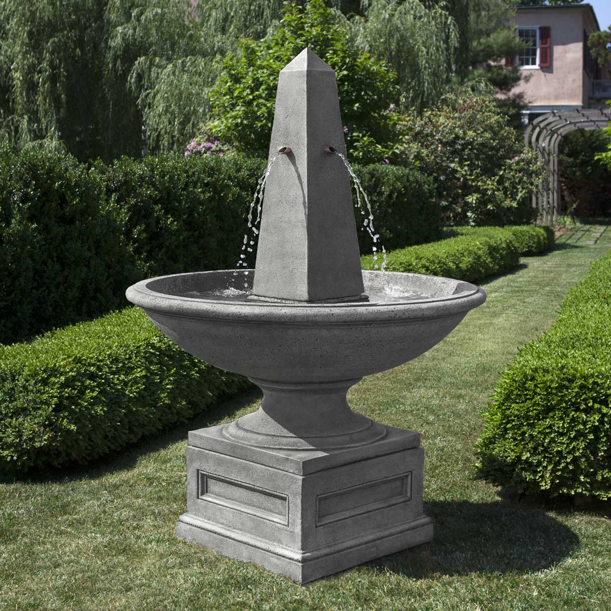 The unusual Obelisk Element inside the elevated basin gives the Condotti Obelisk Fountain both round and linear qualities. Great in a space where you aren’t sure what shape is going to look better. Available in 12 different patinas. The Condotti Fountain is also available without the obelisk.