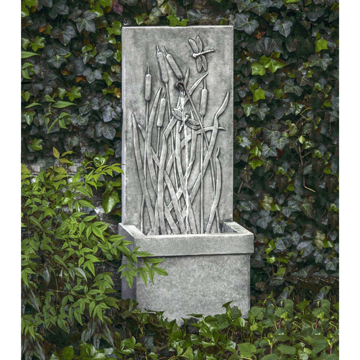 As its name suggests, our Dragonfly Wall Fountain features a nature scene design of flying insects amidst willowy reeds. It provides a lovely landscaping accent, tucked against a garden wall and surrounded by lush plants, and produces a gentle flow of water that spills from a central spout into a square trough below.