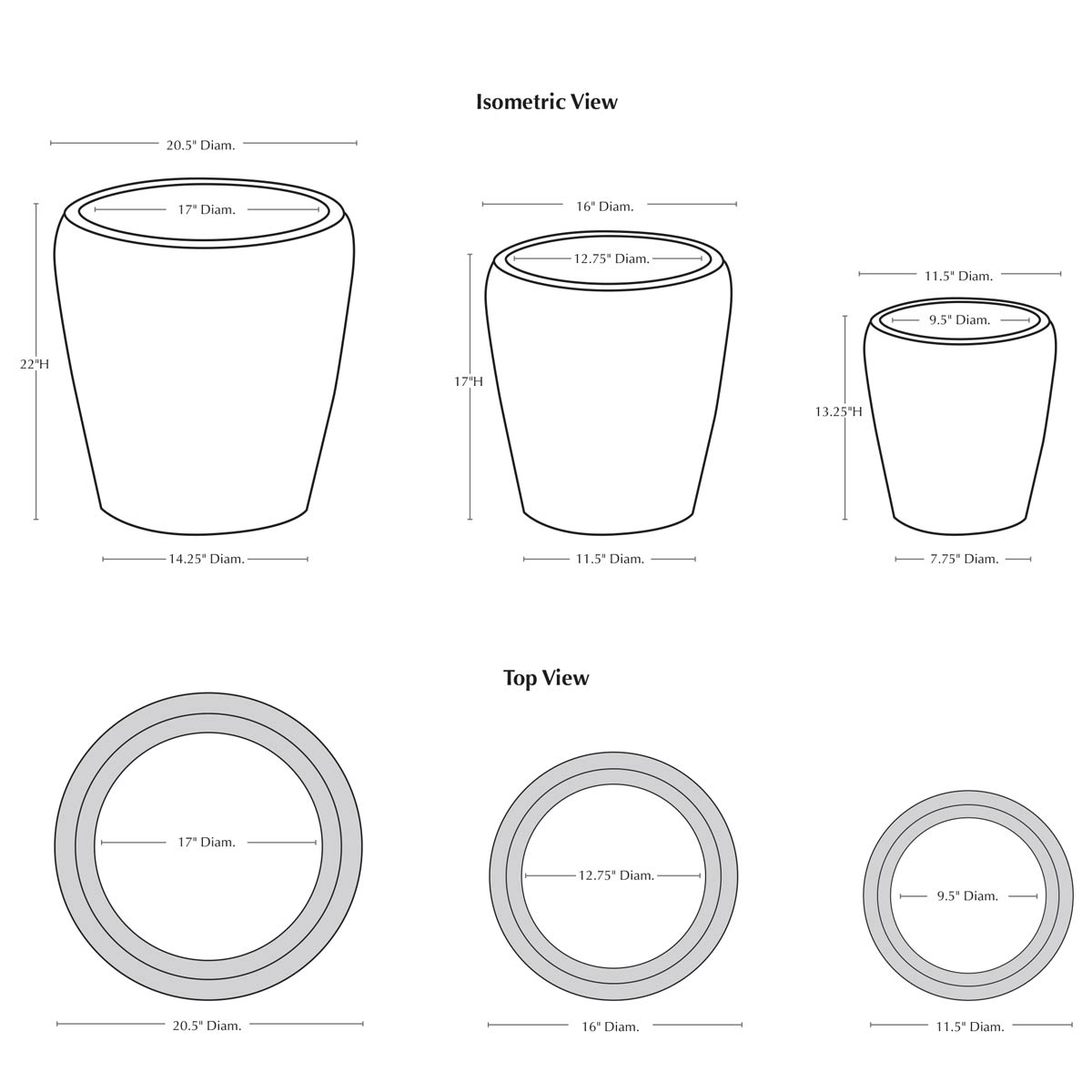 | Size | Set of 3 20.5" DIA x 22"H | 62 lbs 16" DIA x 17"H | 36 lbs 11.5" DIA x 13.25"H | 20 lbs |