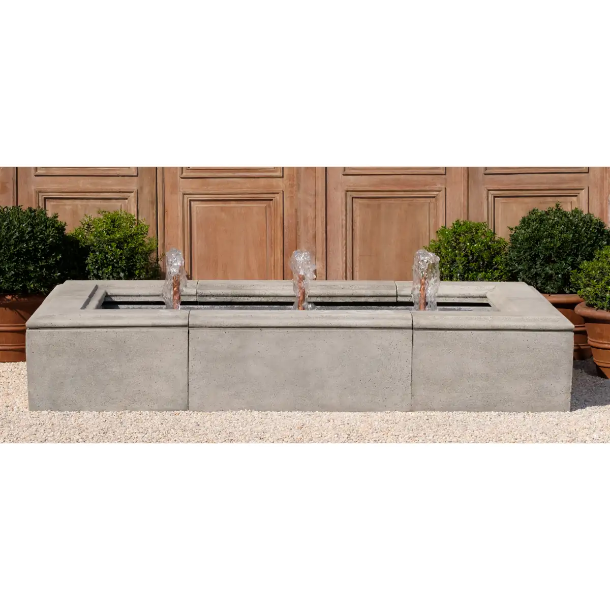 The simple yet modern Embarcadero Fountain features a large rectangular basin punctuated by three vertical copper pipe spouts. Its lower profile makes a great choice for those wanting a more subtle water feature for their outdoor area. Choose from a variety of timeless cast stone finishes.