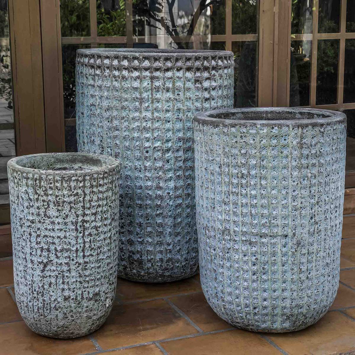 Available as a set of three, the Escada Planters have a narrow cylinder shape with a textured square pattern and two glaze finish options. These terracotta containers include a drainage hole in the base and are an excellent choice for deep rooting specimens. *As shown in Verdigris