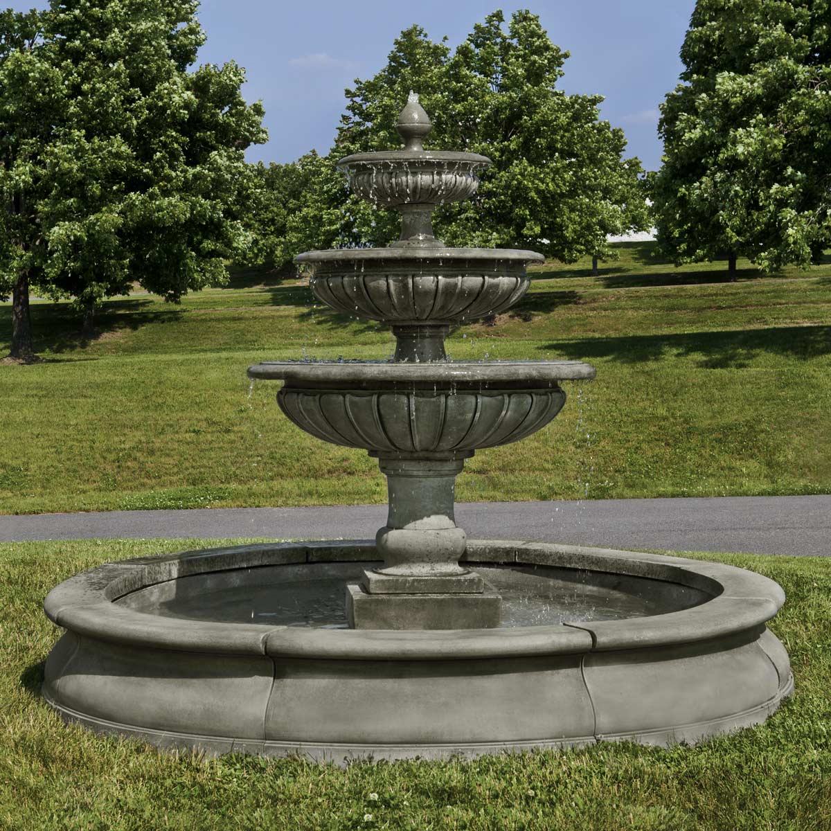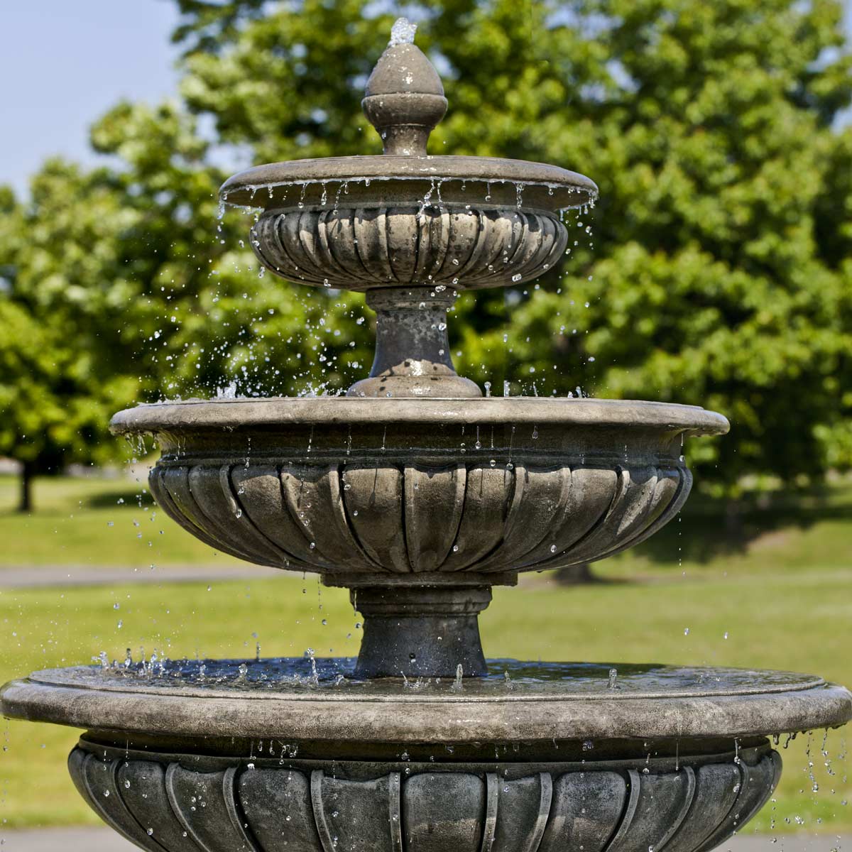 This grand-scale Estate Longvue Fountain has three round tiers for water to pour off of, and an enormous 8 1/2-foot wide basin to spill into. Also available as a smaller two-tier fountain or three-tier fountain, without the basin.