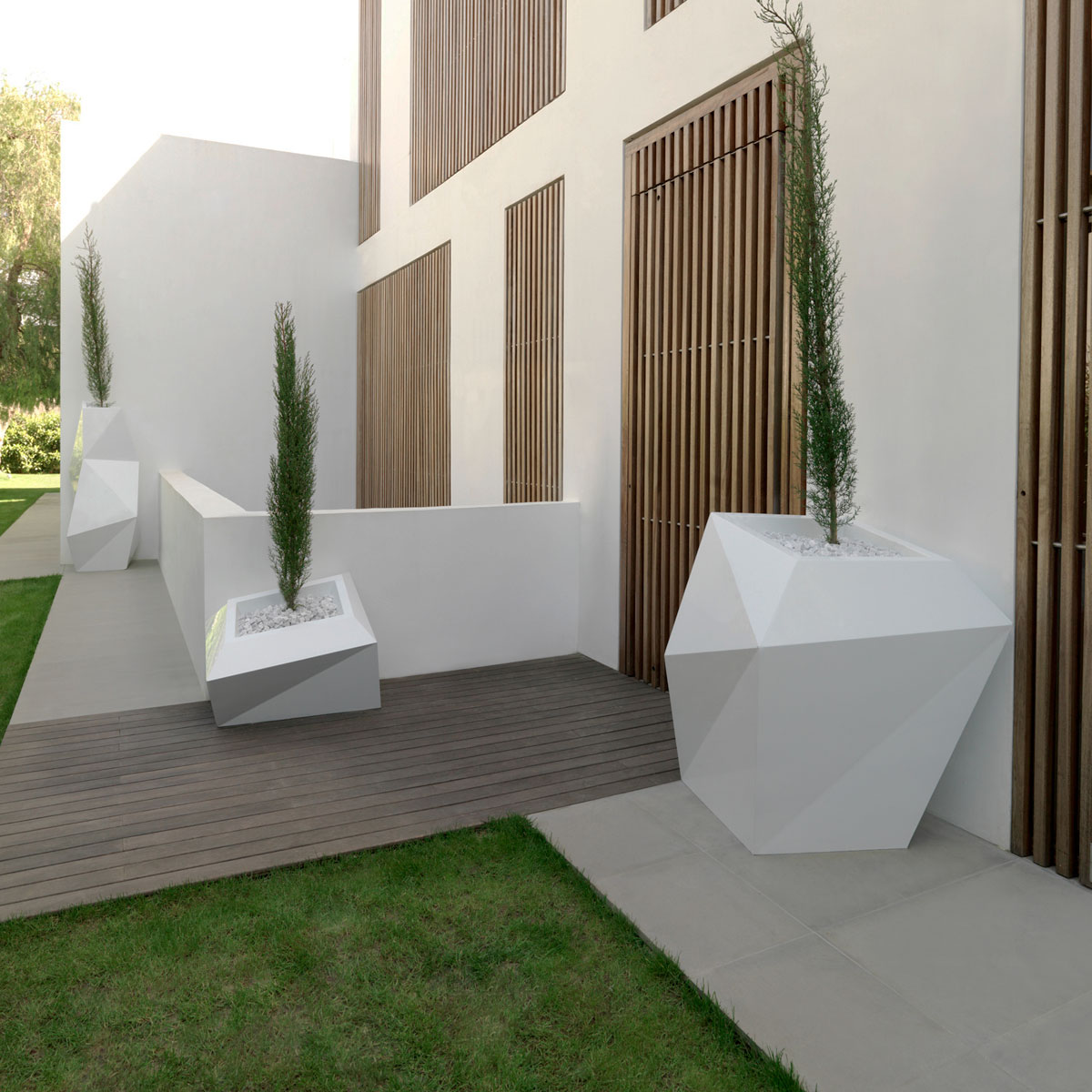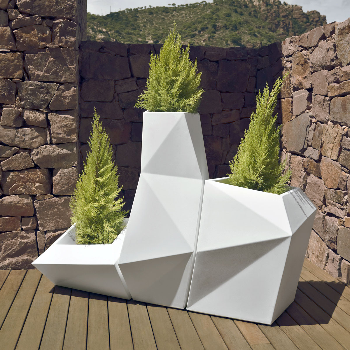 Distinctly modern, the Faz Planter Pots are part of a modular outdoor collection. Their geometric forms are crafted from lightweight yet durable polyethylene resin and come in a variety of matte finish colors. Snug three planters (from either the smaller or XL set) together or apart to create visual interest in your outdoor area. Each pot sold separately. *As shown patina: White.