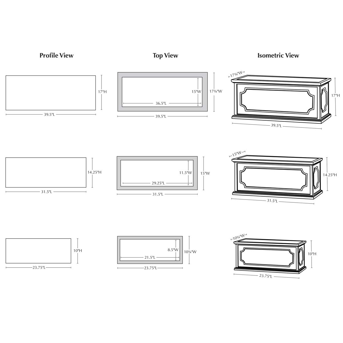 | Size | 23.75"L x 10.75"W x 10"H | 10 lbs 31.5"L x 15"W x 14.25"H | 18 lbs 39.5"L x 17.75"W x 17"H | 25 lbs |