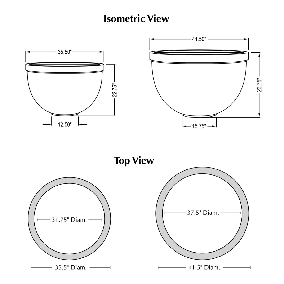 | Size | 35.5″DIA x 22.75″H | 361 lbs 41.5″DIA x 26.75″H | 498 lbs |