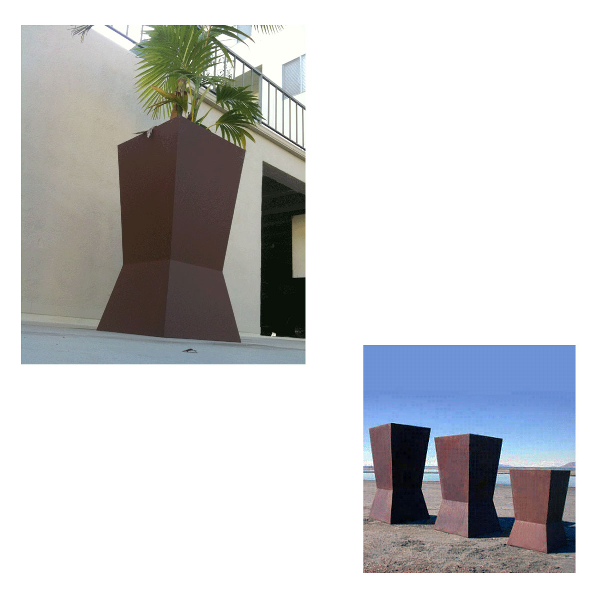 Made in the USA. Metal elements are designed for form and function. Fully customizable to fit into the design intention of your space. Very impactful statement pieces. Planters, firepits, benches, and water features are built to withstand the abuse of placement at commercial sites. They are extremely durable and able to withstand freeze-thaw cycles.