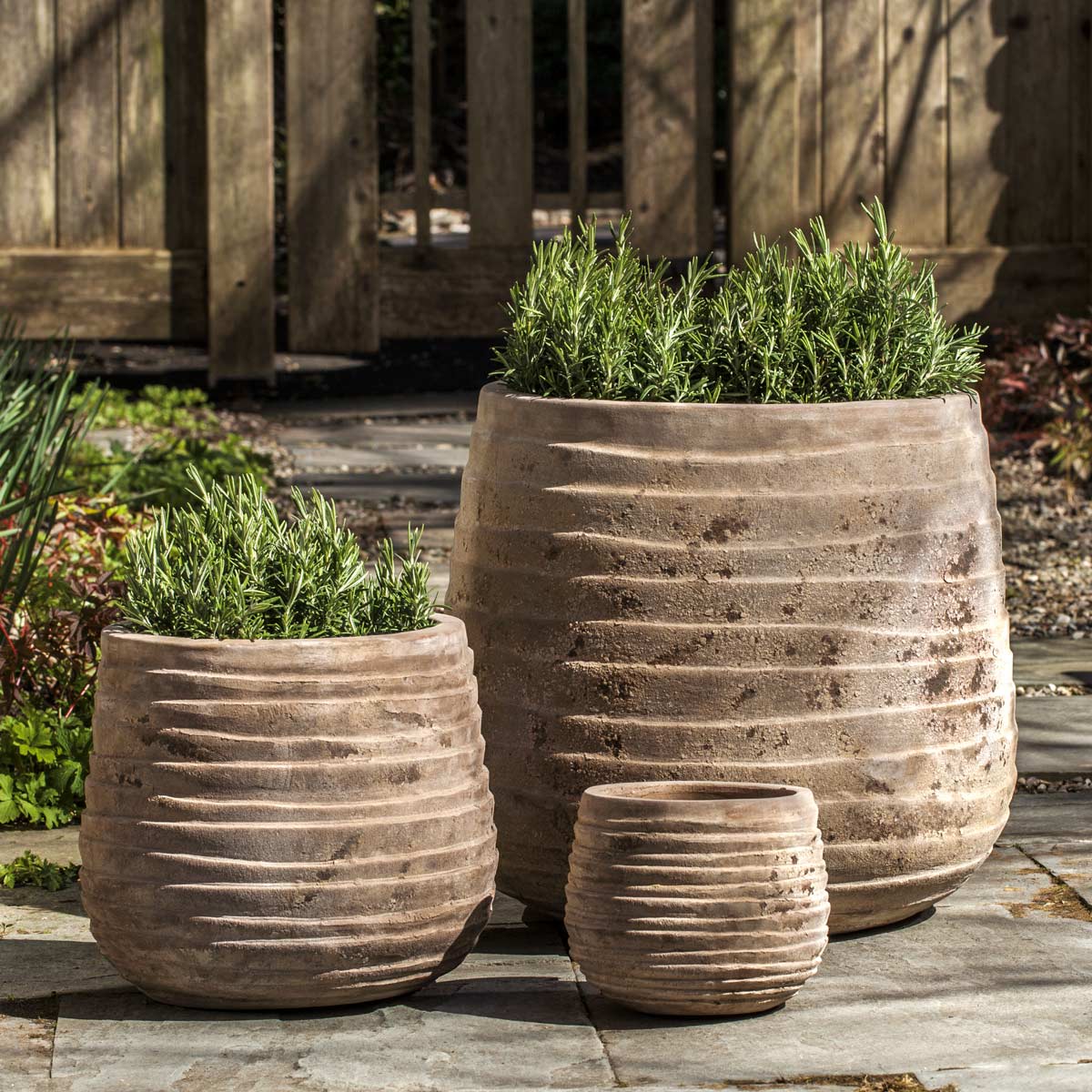 A textured layer pattern gives the set of three Ipanema Planters a contemporary look, ideal for the compact outdoor garden space. These terracotta containers include a drainage hole in the base and are also available as the Tall Ipanema Planter set.