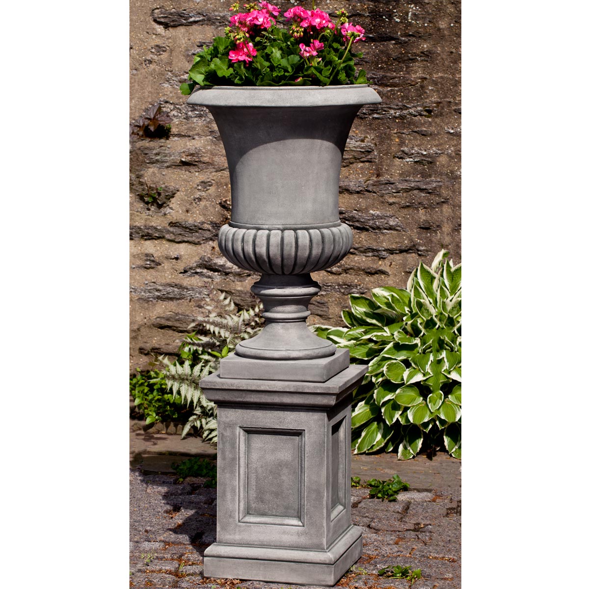 The Kent Urn with Barnett Pedestal combines a traditional urn design with an elegant block pedestal. This striking cast stone pair adds flair to both contemporary and classic landscapes.