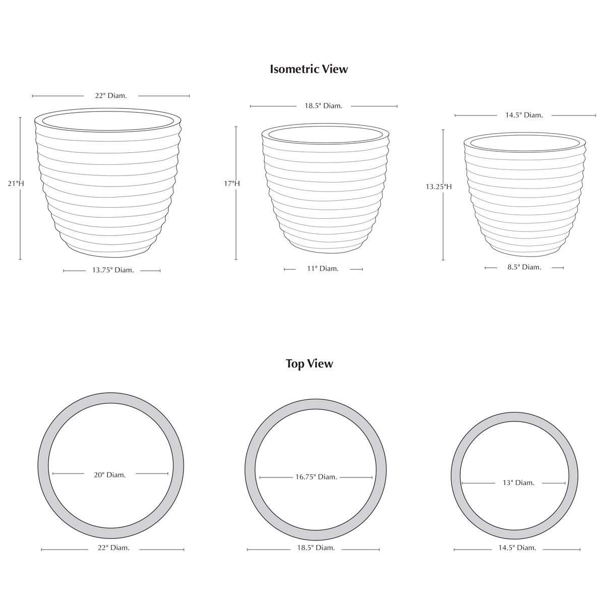 | Size | Set of 3 22″DIA x 21″H | 70 lbs 18.5″DIA x 17″H | 46 lbs 14.5″DIA x 13.25″H | 26 lbs |