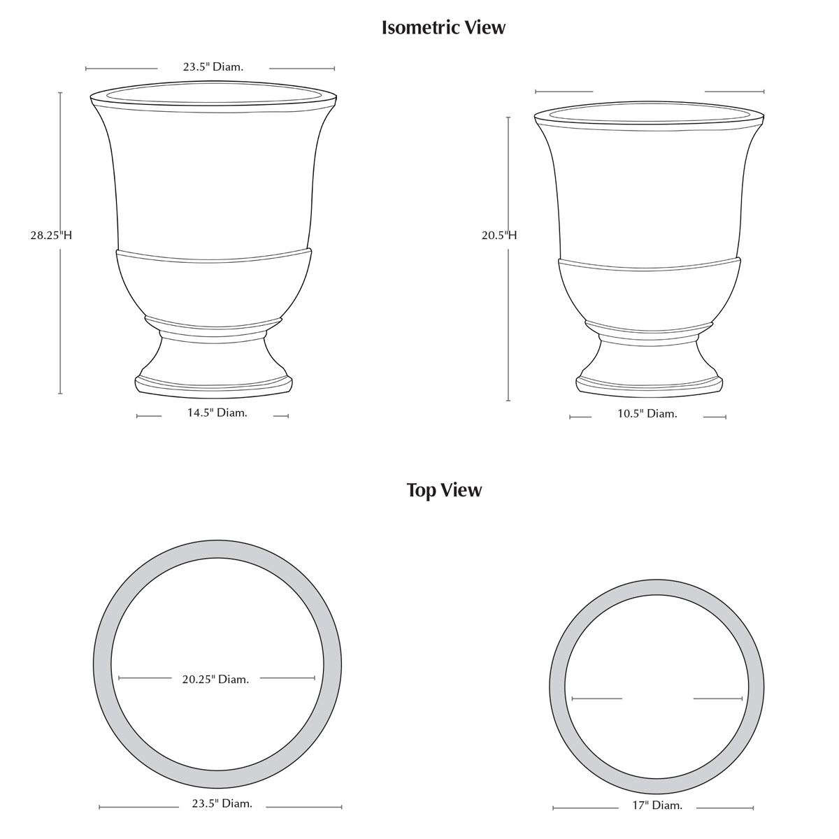 | Size | Set of 2 23.5"DIA x 28.25"H | 96 lbs 17"DIA x 20.5"H | 38 lbs |