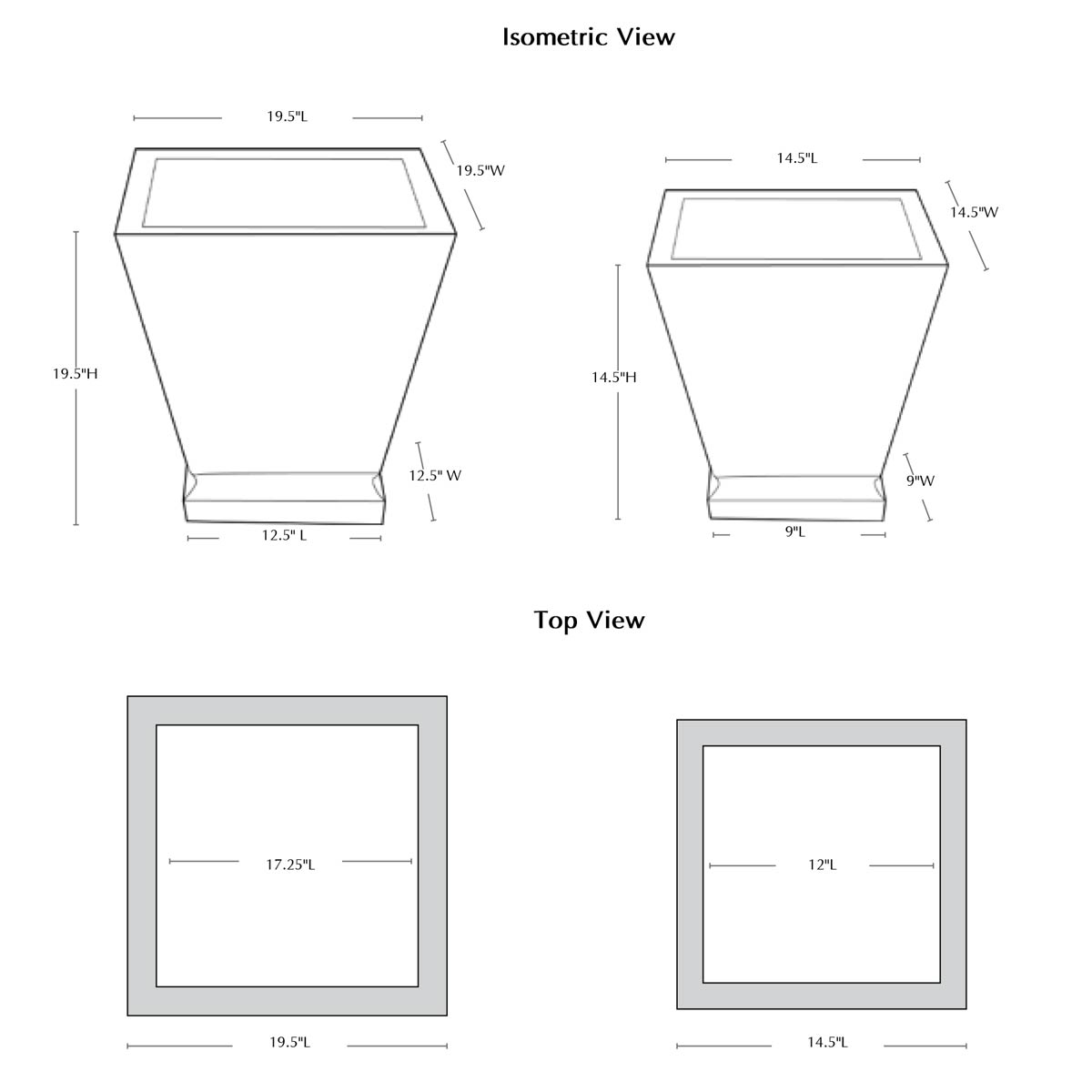 | Size | Set of 2 19.5"W x 19.5"L x 19.5″H | 63 lbs 14.5"W x 14.5"L x 14.5″H | 31 lbs |