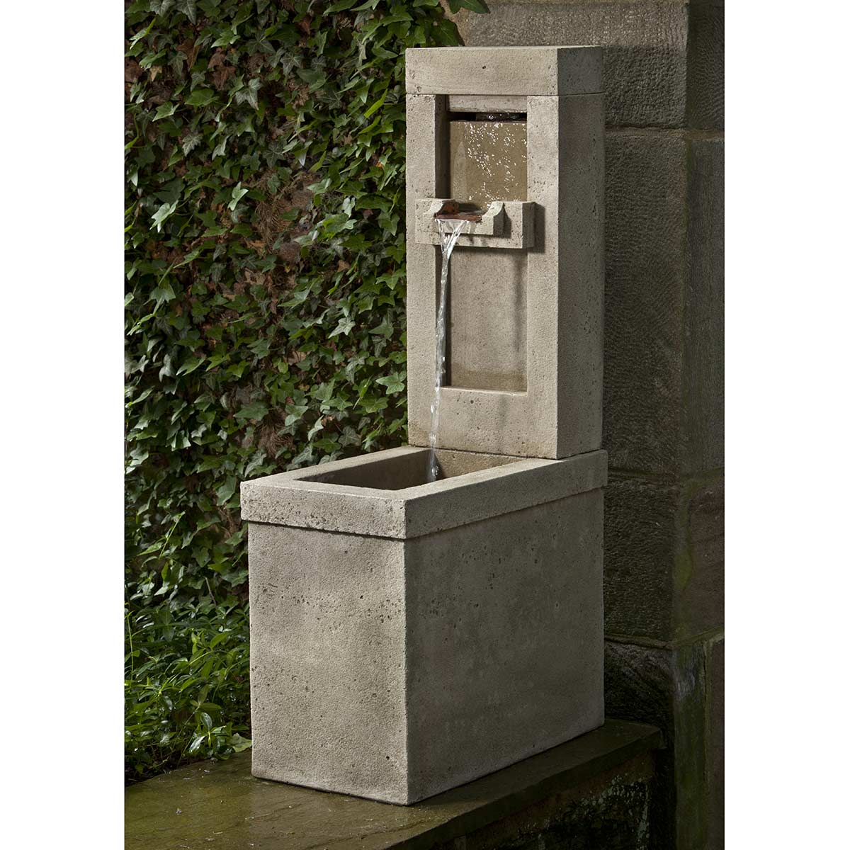 With the Lucas Fountain, water pours from a wide, flat, central water spout and is collected in the large pool bowl. This wall fountain can either be mounted at ground level, or it would be perfect to install at the place where a low wall meets with a higher wall.