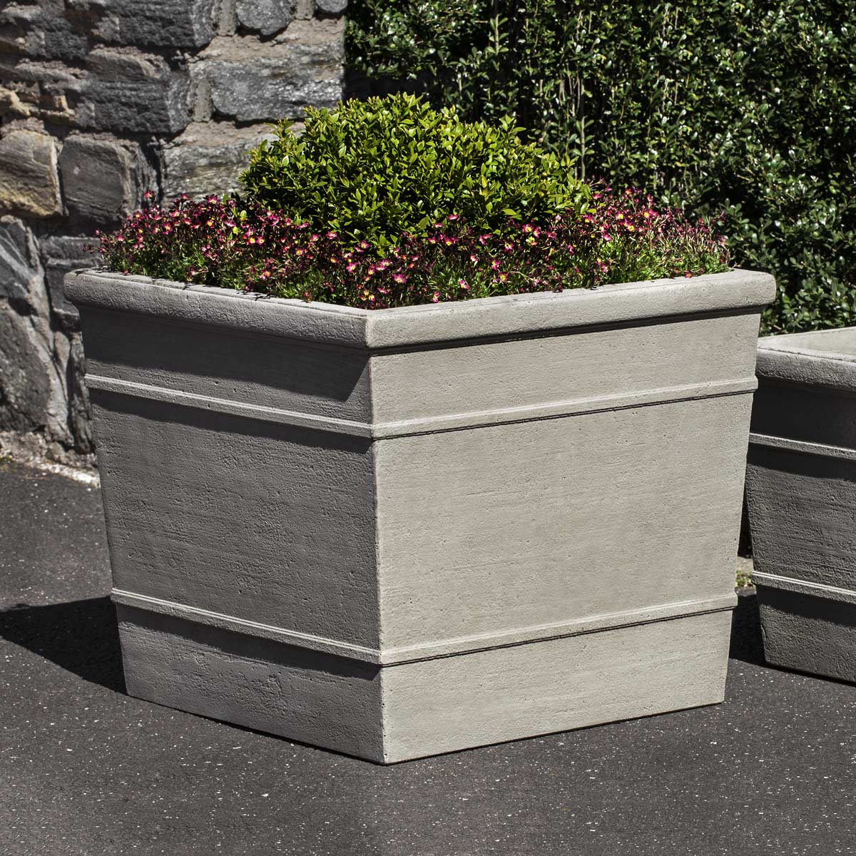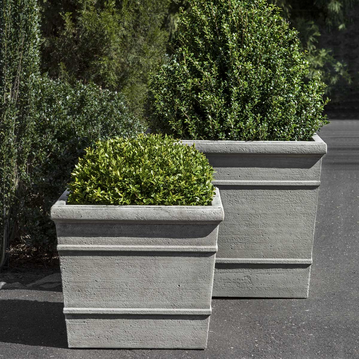 A gently rolled lip softens the tapered cube edges of the Marin Planters. Available in three sizes, these versatile containers are crafted from cast stone in 14 different finishes. Mix and match or group the same sizes, then fill with dense shrubs to create a green barrier in your outdoor area.