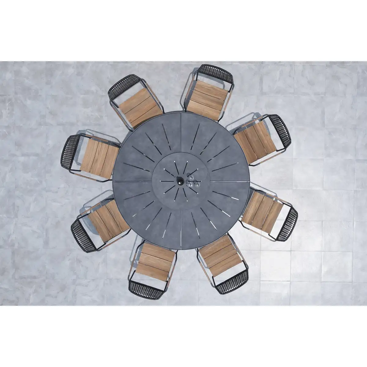 The innovative MEIKA outdoor furniture collection features distinctive style, and is suitable for commercial or residential use. This all-weather 71″ MEIKA Round Dining Table is made of stainless steel in a hairline or powder-coated finish with a high pressure laminate (HPL) top featuring a built-in, 29.5″ rotating “lazy Susan” tray in the center. Seats 6-8.