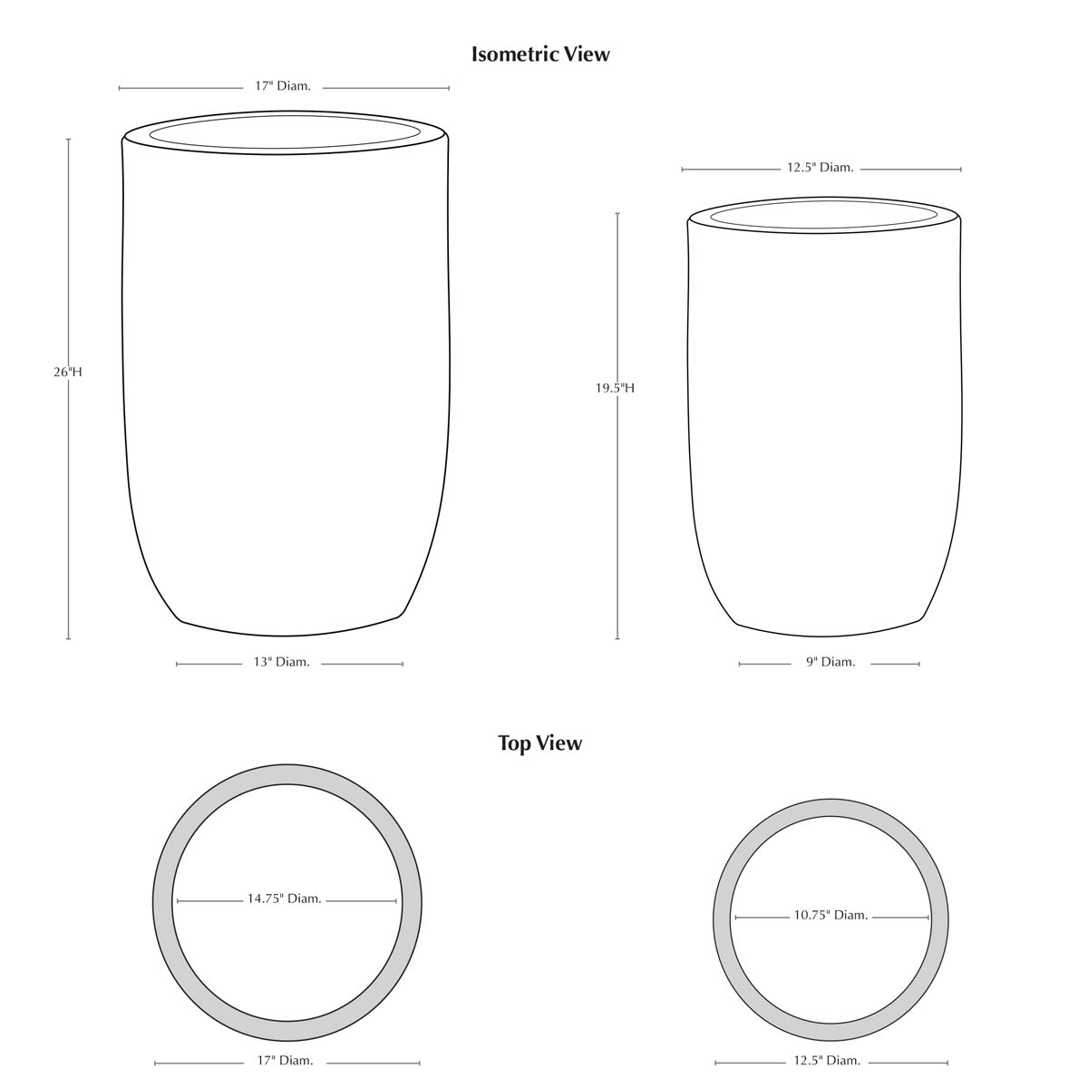 | Size | Set of 2 17″DIA x 26″H | 79 lbs 12.5″DIA x 19.5″H | 40 lbs |
