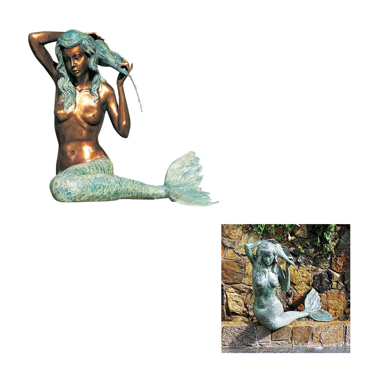 Mermaids are imaginary and mythical creatures of legendary allure. Our lovely, life-size Mermaid Fountains are just as alluring and, best of all, they’re obtainable! With exceptional detail and available in two finishes and two sizes, our brass mermaid will add magic and mystery to your garden pond or pool. This fountain will not rust, but will develop a verdigris (gray-green) patina due to the chemical reaction of moisture on brass. Our mermaid fountain is shown in verdi with bronze highlights, and the inset in all verdi.