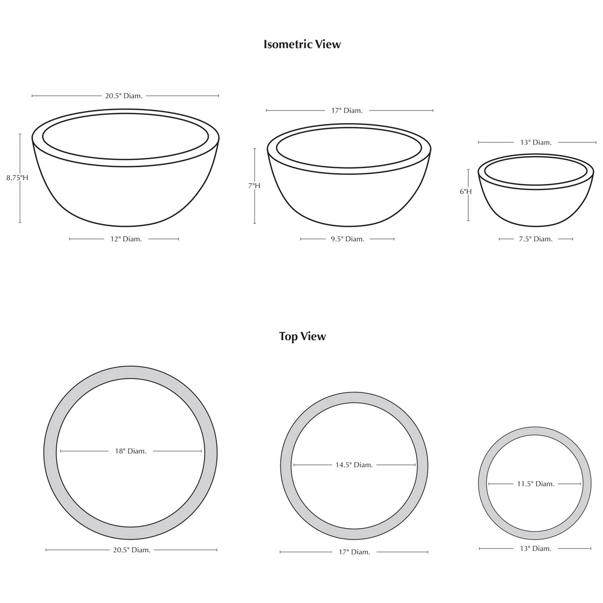 | Size | Set of 3 20.5"DIA x 8.75"H | 35 lbs 17"DIA x 7"H | 22 lbs 13"DIA x 6"H | 13 lbs |