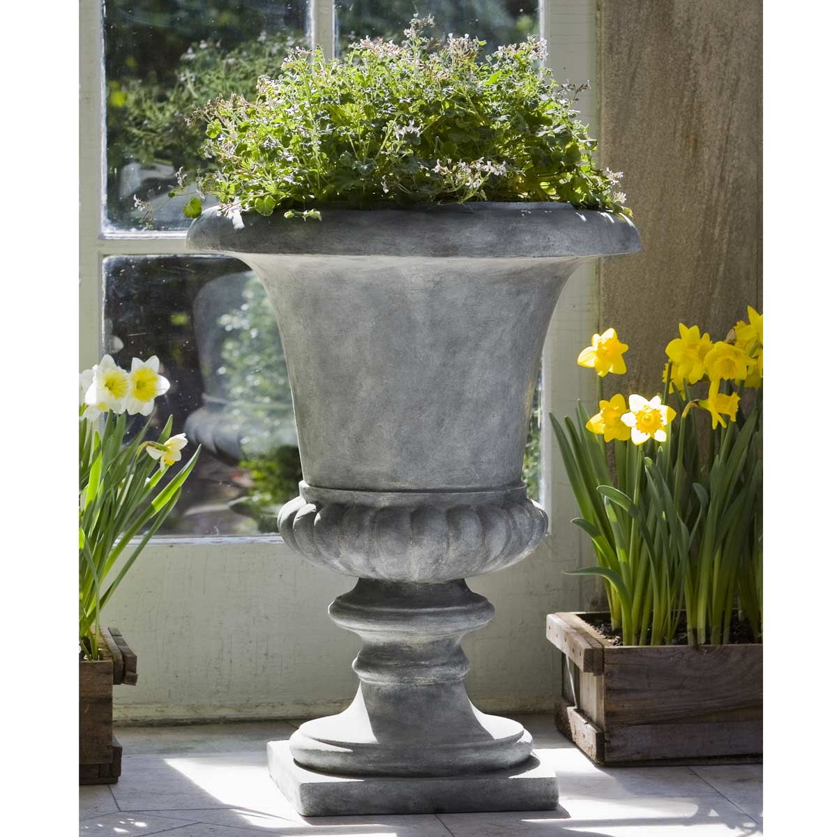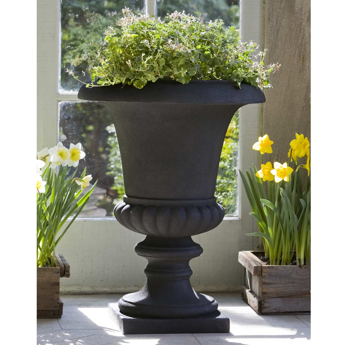 Ideal for more traditional outdoor spaces, our Morganna Planter Urn on a pedestal base is crafted in durable and lightweight fiberglass. Choose from classic gray or black finishes to emphasize your favorite shrub, plant or flowers. Place one alone as a garden feature, or, on either side of a path or entryway for a formal aesthetic.