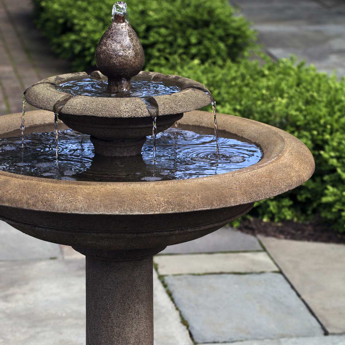 An ideal centerpiece for smaller courtyard and patio spaces, our Palos Verdes Fountain has a simple form that blends with a variety of landscape styles. This garden fountain has two bowl tiers, decorative finial, and a pedestal base. It produces a gentle overflow of water for background ambiance and enjoyment.