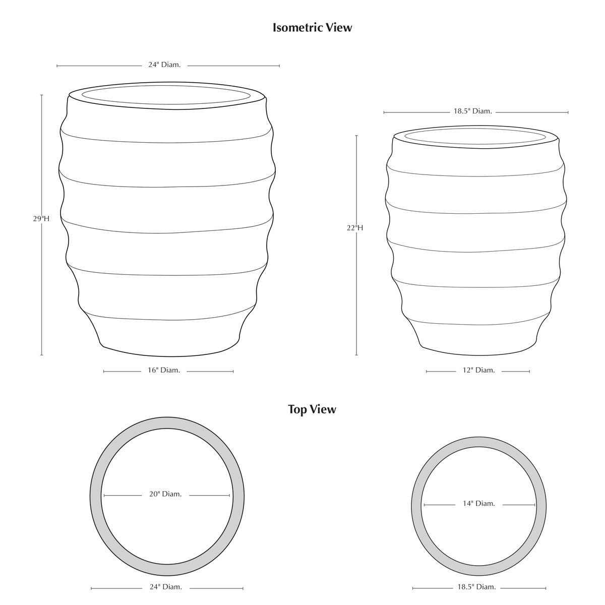| Size | Set of 2 24″DIA x 29″H | 134 lbs 18.5″DIA x 22″H | 69 lbs |