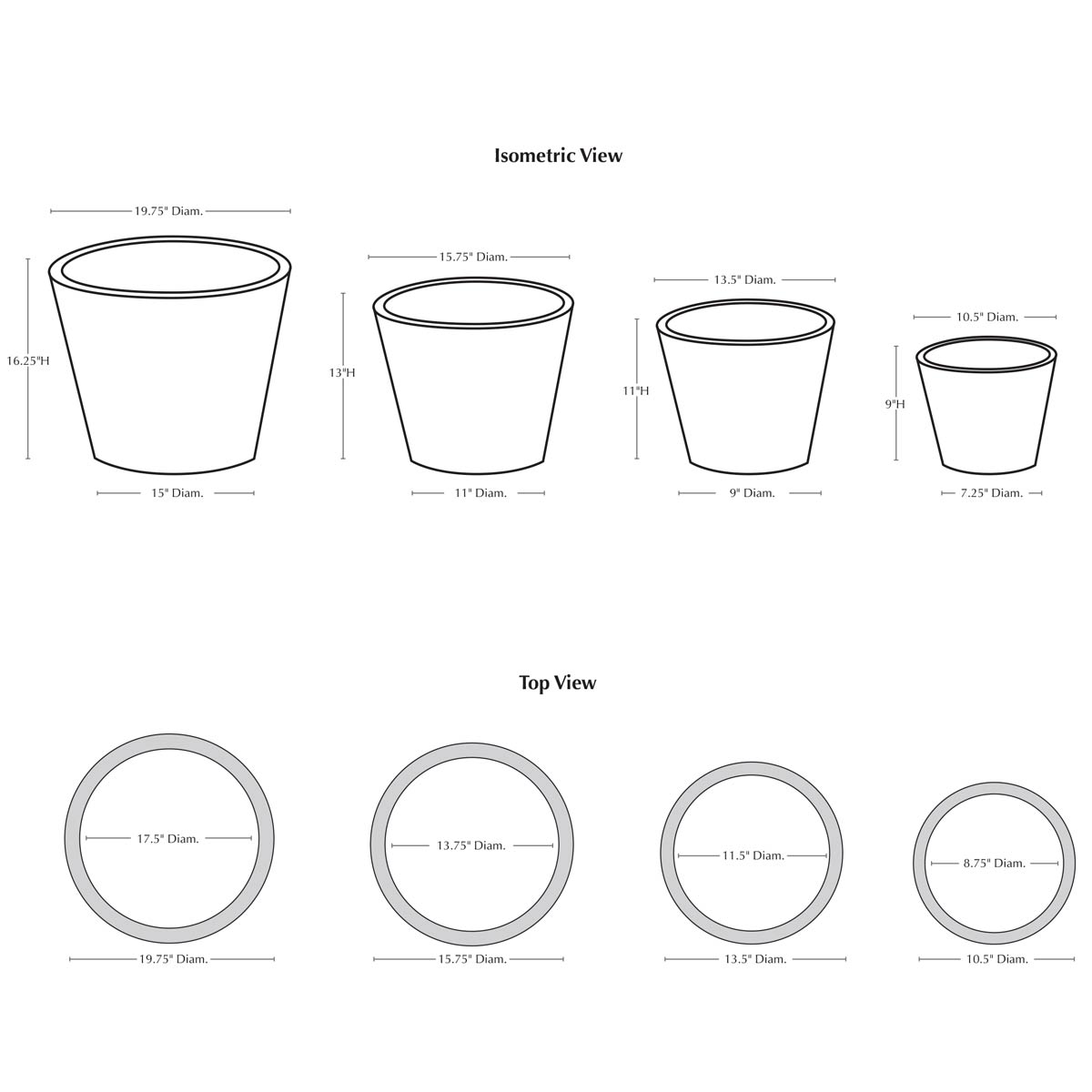 | Size | Set of 4 19.75″DIA x 16.25″H | 48 lbs 15.75″DIA x 13″H | 28 lbs 13.5″DIA x 11″H | 20 lbs 10.5″DIA x 9″H | 11 lbs |