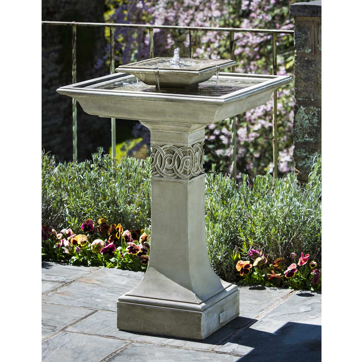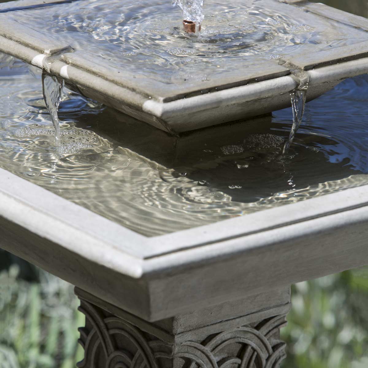 A linear update on a classical style, our Portwenn Fountain makes a compact and attractive water feature for smaller outdoor patio or garden spaces. The clean lines of this pedestal garden fountain feature a circular pattern detail and an elevated bowl that trickles water into the square basin below, producing a gentle and soothing sound effect.
