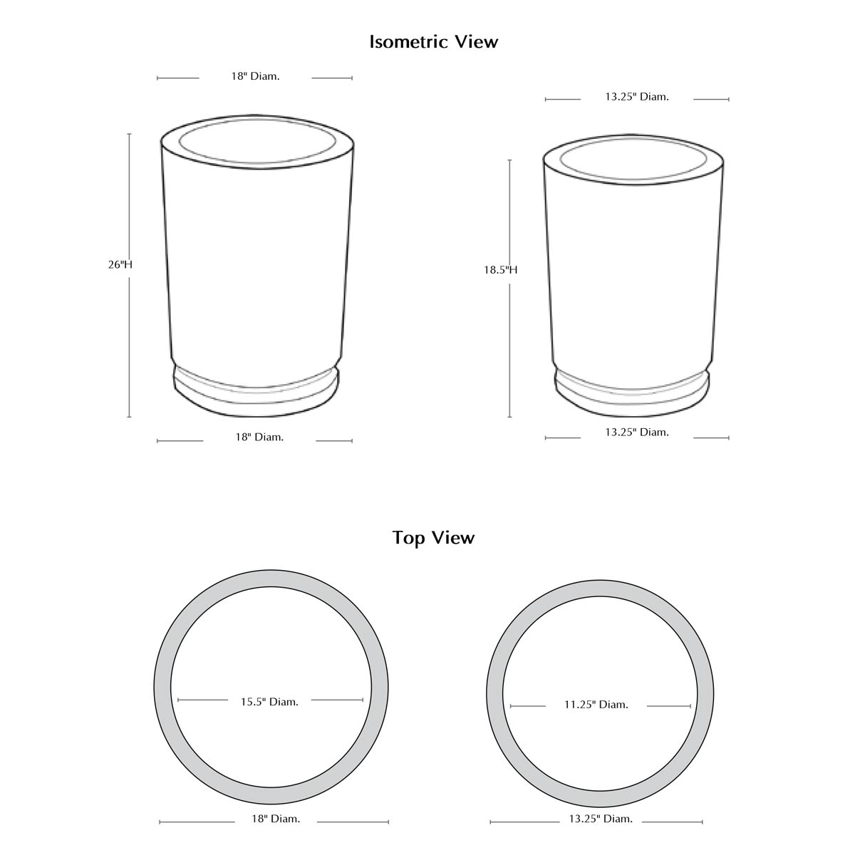 | Size | Set of 2 18"DIA x 26.5″H | 73 lbs 13.25"DIA x 18.5″H | 34 lbs |