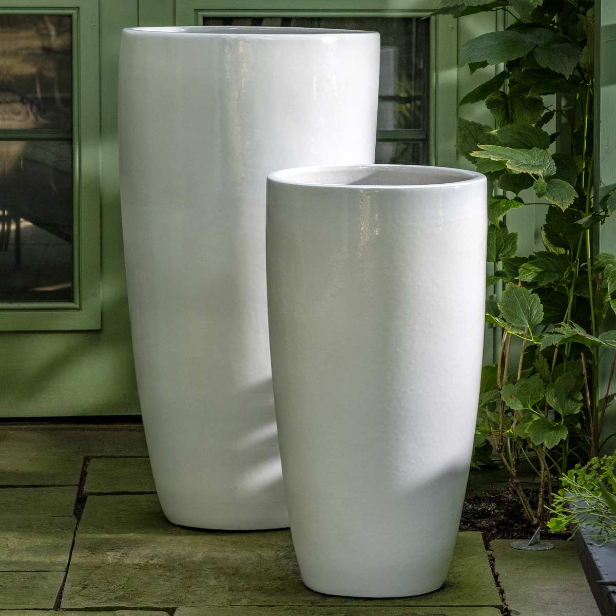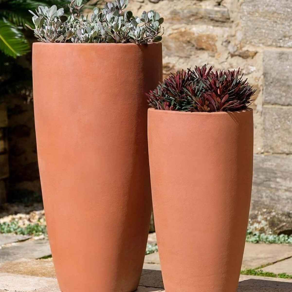 The two-piece Rioja Planter set is available in several contemporary finishes, with slender forms that add vertical dimension in outdoor garden areas. Handcrafted from terracotta, these containers offer a modern esthetic and include drainage holes in the base.