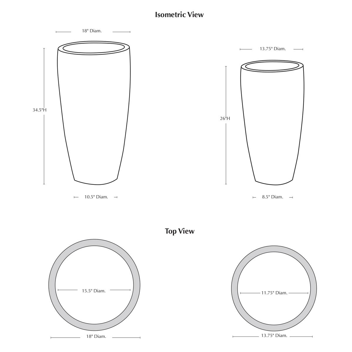 | Size | Set of 2 18″DIA x 34.5″H | 82 lbs 13.75″DIA x 26″H | 43 lbs |