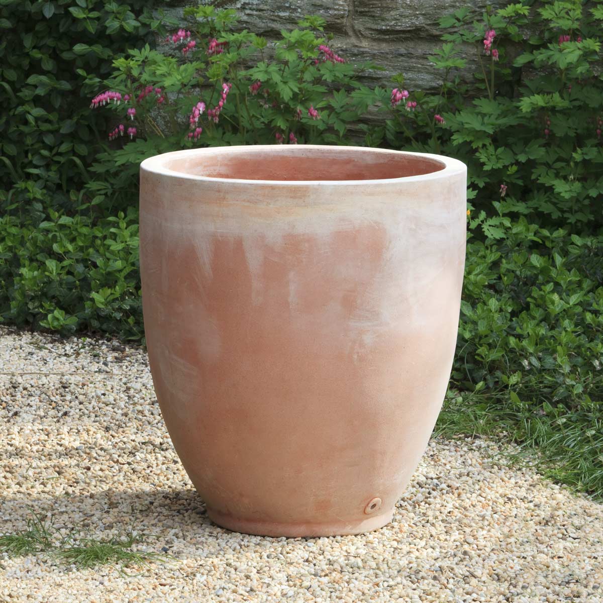 The simple form of the Rovigo Planter is handcrafted from terracotta and comes in two natural finish options. This generous size garden container includes a drainage hole and works well for a variety of medium to deeper rooting plant specimens.