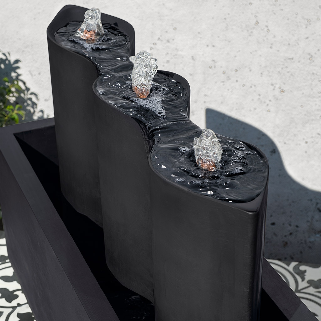 The modern form of the Samba Fountain features three wavy spouts that create a striking design combined with a tranquil soundscape. Crafted from cast stone in a variety of finish options, use this large basin fountain as a contemporary water feature to enhance any outdoor space.