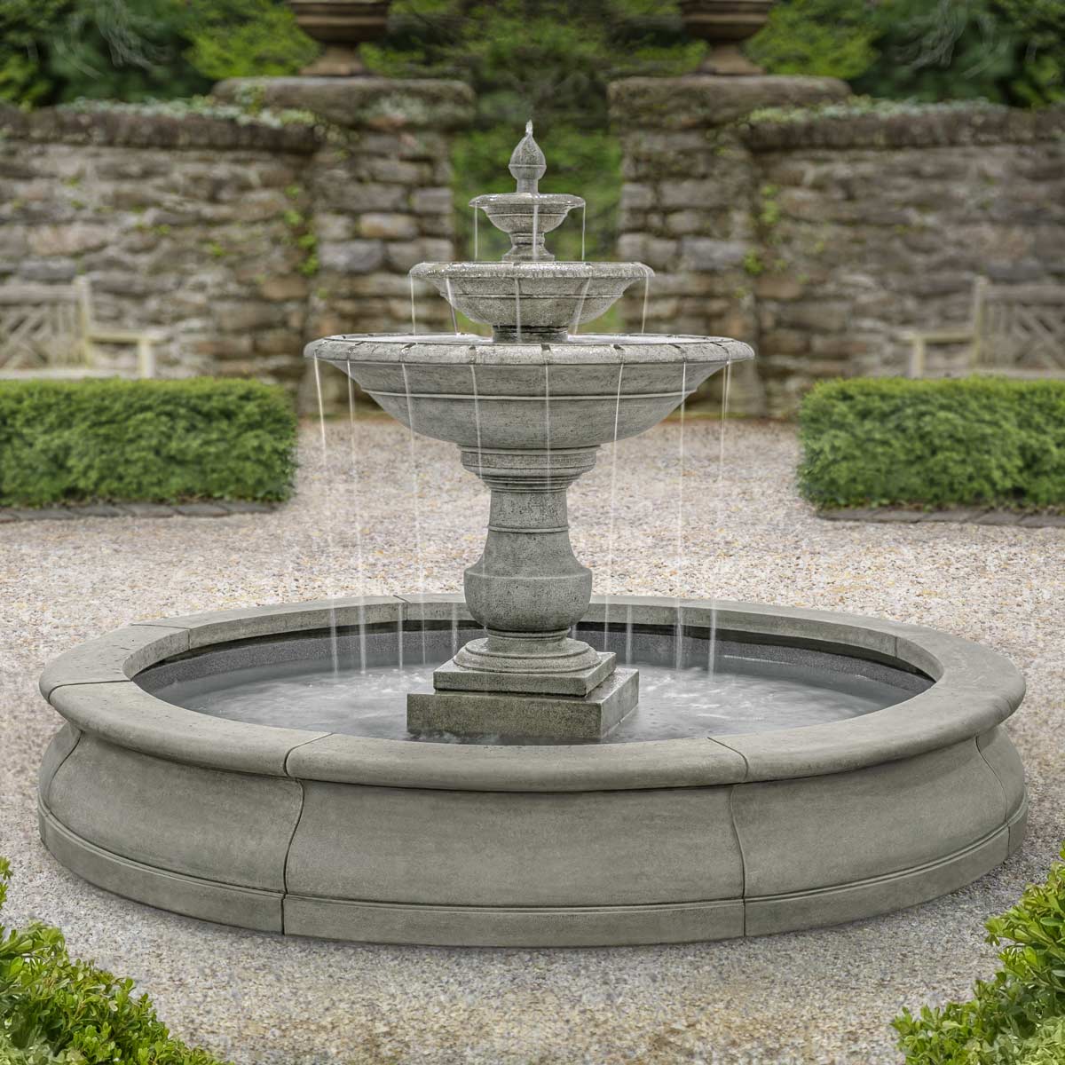 A water feature on a grand scale, the Savannah Estate Fountain features a central, multi-tier pedestal inside a large diameter basin. It makes a handsome addition to formal courtyard areas or large driveway turning circles, and is crafted in a variety of timeless cast stone finishes. Also available without the basin, as the Savannah Fountain.