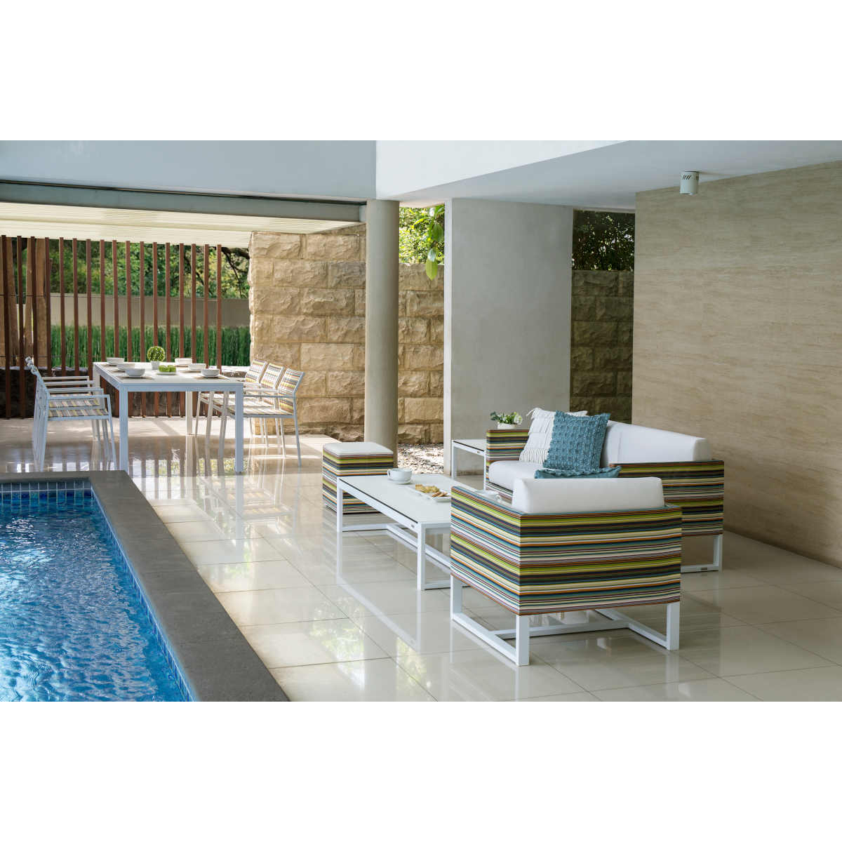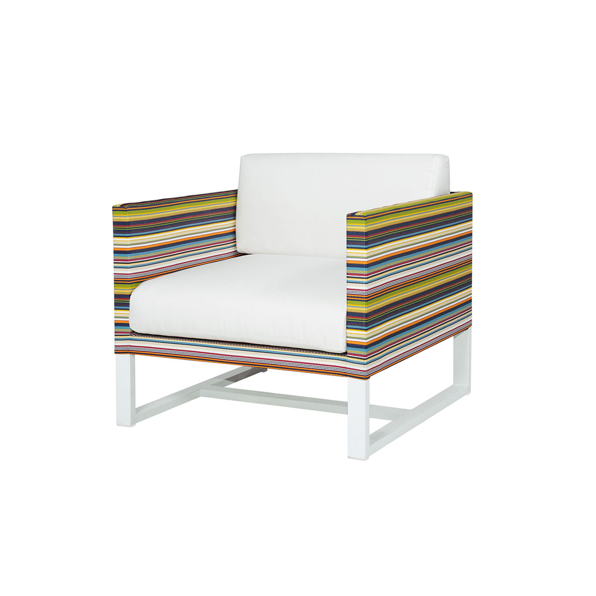 Featuring stunning, nautical-inspired upholstery detailing, the STRIPE seating collection brings vibrant color and designer style to outdoor spaces. The comfortable STRIPE Sofa 1-Seater armchair is made from a powder coated aluminum frame and all-weather upholstery with canvas cushions.