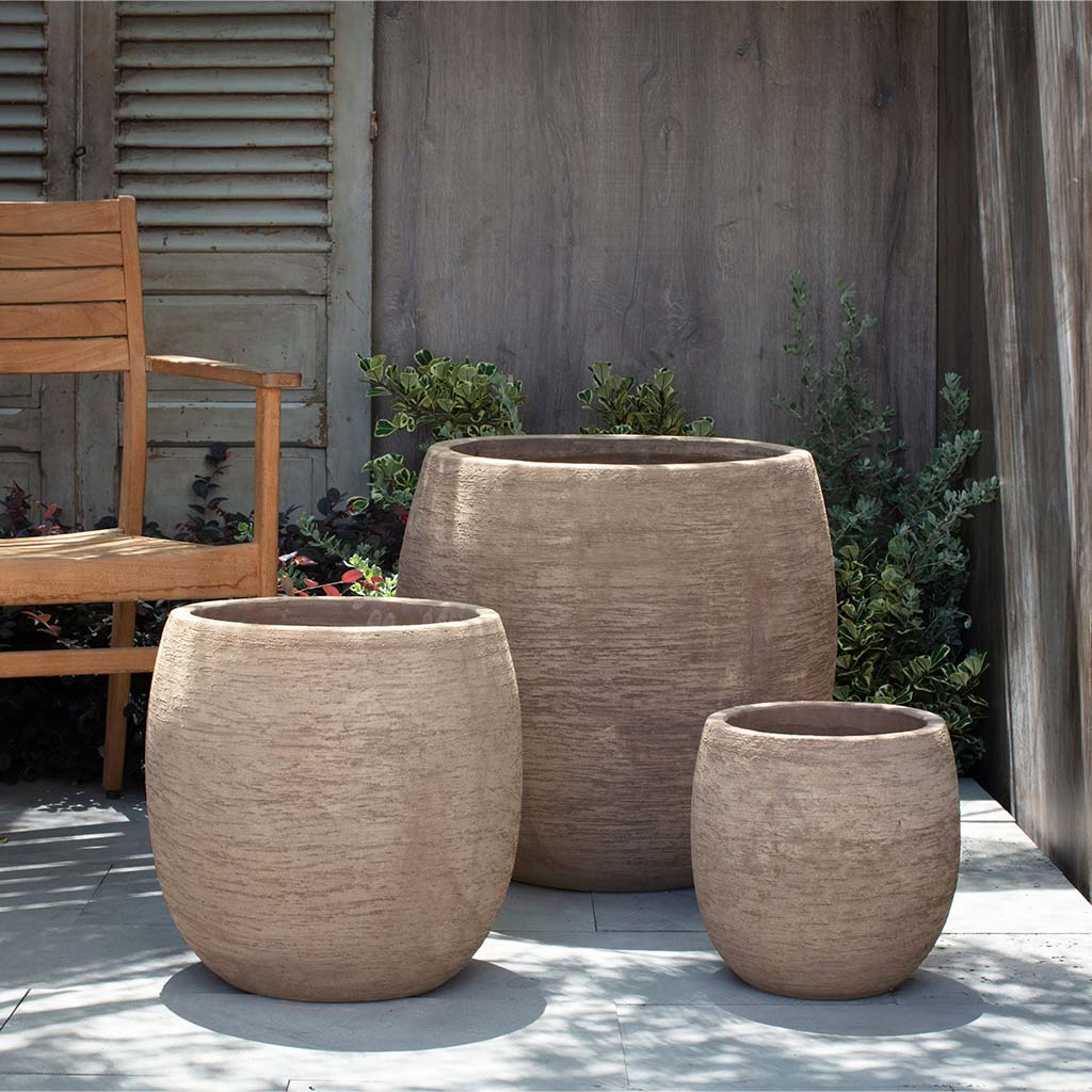 Our three-piece Tahoe Planter set showcases a simple yet elegant design, with a horizontal textured finish that adds visual interest to the rounded terracotta shape. The three container sizes add a natural aesthetic to your outdoor space, allowing for versatile arrangements of small shrubs, cacti, and more.