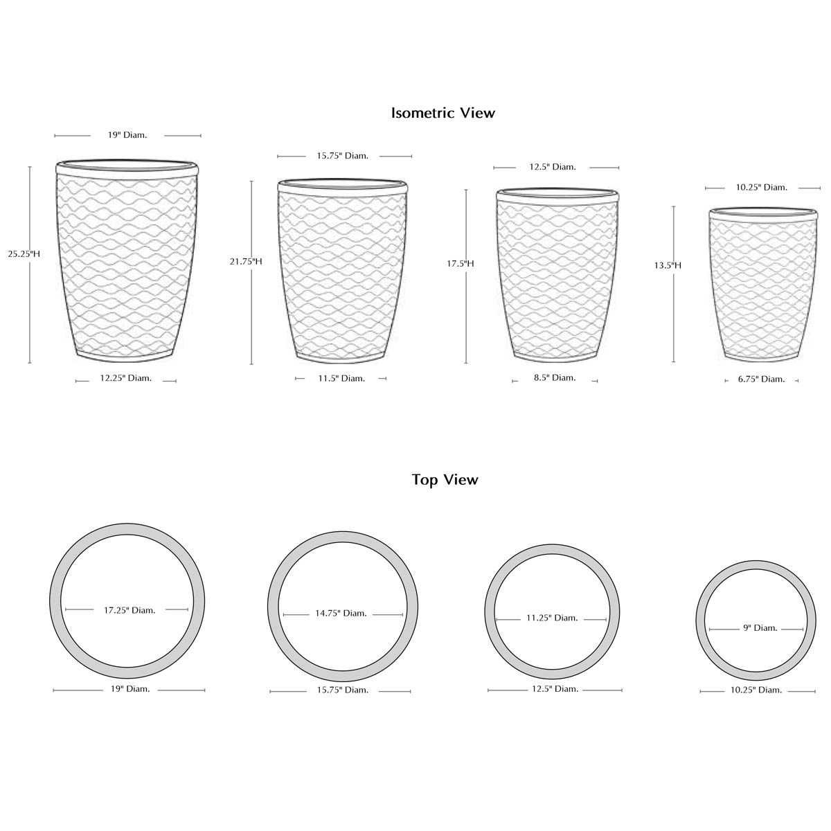 | Size | Set of 4 19"DIA x 25.25"H | 74 lbs 15.75"DIA x 21.75"H | 48 lbs 12.5"DIA x 17.5"H | 28 lbs 10.25"DIA x 13.5"H | 16 lbs |
