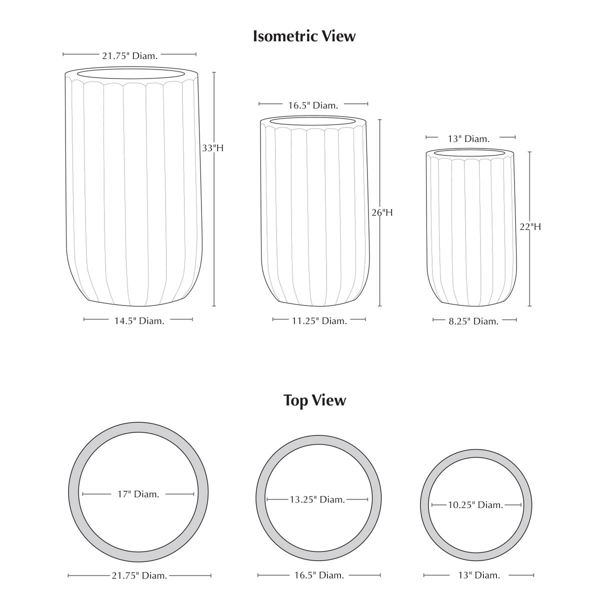 | Size | Set of 3 21.25″DIA x 33″H | 161 lbs 16.5″DIA x 26″H | 71 lbs 13″ DIA x 21.75″H | 49 lbs |